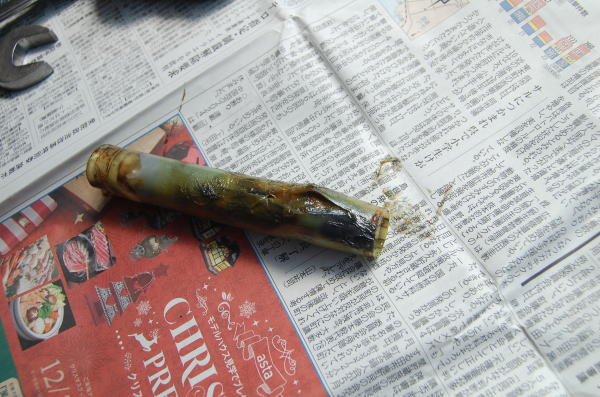 ですが、経年劣化やプラスチックに浸透するようなグリスを入れているとプラスチック製のグリスチューブが裂けたりします(右の写真です)