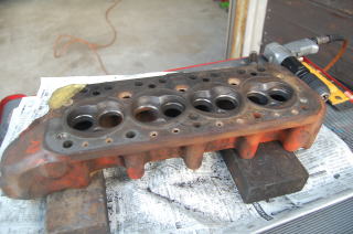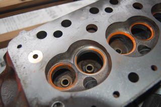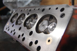 キレイにしたヘッドを修正面研に出して 内燃機屋さんから帰ってきたら バルブシートが大きく広がっていれば幅を修正 バルブをすり合わせた後は 光明丹を使ってあたりをみます。 光明丹とオイルの配合をかなり粘り強くして あたりをみるのですが悪い場合は色が付かない部分がわかります(配合を緩くするとほぼ色がついてしまうので点検の意味が無くなります) このヘッドは1番と4番のインレットが少し良くないようでした |
